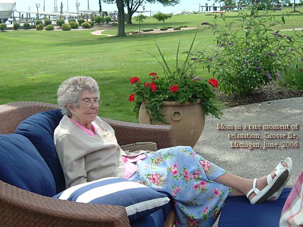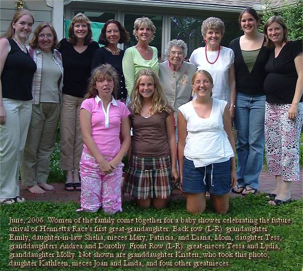 Mom believed with all of her heart that Jesus died for her sins. I believe she is with Him now, and with Gregory, her second child, and Corinne, her grandchild, both of whom preceded her. I pray that through faith in the God she honored with her life, each of her children, her grandchildren, and her friends can live up to her example. Mom's ObituaryHenrietta Race, of Grosse Ile, Michigan, passed away September 15, 2006. Born in Russia, Ohio in 1928, Henrietta spent many years helping her mother Marie, her brother Carl, and her sisters Eleanor and Margaret run the family farms in Russia, Miamisburg, and Celina, Ohio. Henrietta graduated from Houston High School. In 1947, she married former Serviceman Donald Lee Race. They settled in Donnelsville, Ohio, joined the Sacred Heart parish in New Carlisle, and had four children, Theresa, Gregory, Paul, and Kathleen. In 1964, the Races moved to Miamisburg, Ohio. When Donald retired in 1976, he and Henrietta moved to a small farm near Edmore, Michigan, where they made many friends, especially in the St. Margaret-Mary Alacoque parish.In late 2004, Henrietta and Donald moved to Grosse Ile, Michigan. There they have made many friends in the Island Woods apartments and at St. James Episcopal church. Henrietta was preceded in death by her parents Leo and Marie, brother Carl, sister Margaret Doocey, son Gregory, and granddaughter Corinne. Henrietta is survived by her husband Donald, her sister Eleanor Ayers of Russia, Ohio, her children Tess Hoffman, Paul Race, and Kathleen Gardiner, her grandchildren Dorothy Ballard, Jesse Hoffman, Kristen Coppess, Emily and Molly Race, Nicholas, Casey, and Andrea Gardiner, and many nieces and nephews. She will be greatly missed, but we are grateful for the time we had with her and for the way she blessed our lives with her grace, dignity, good humor, and love. ![]()