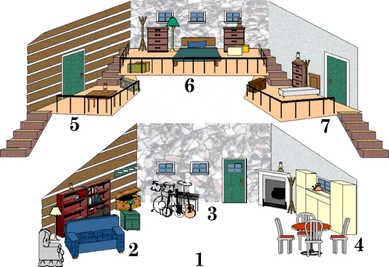 Three physical levels add visual interest as the focus moves from zone to zone. This design should be suitable for dinner theatres, long-running community theatre productions, or (with proper set design) touring companies. For an enlarged (300K) view of the set design, click on the illustration.
