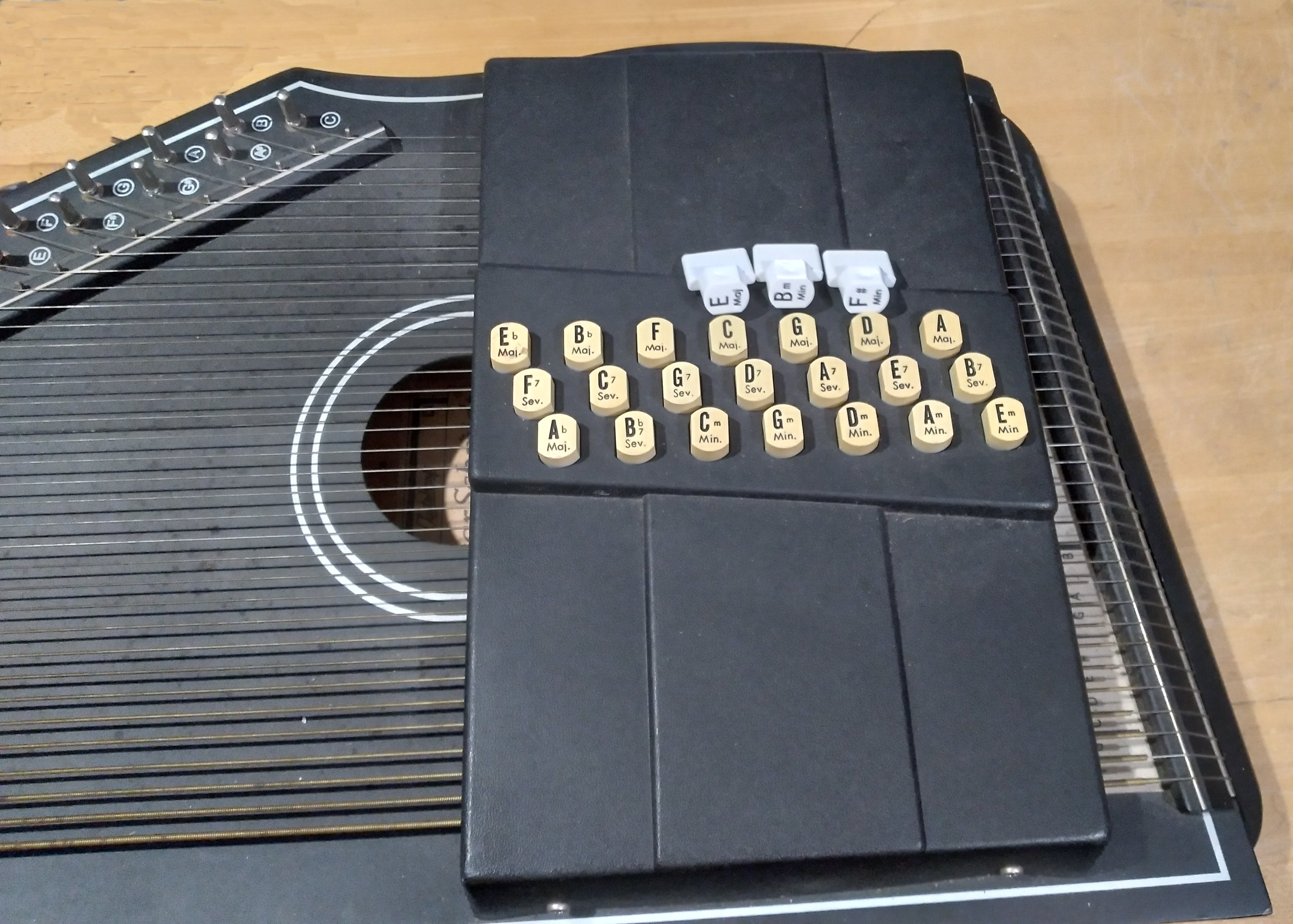 Note: Like the standard 15-button autoharp, this arrangement keeps the "basic" 12 keys the same, even though playing in D is still awkward, and the reach from A to E7 is "dicey." That said, as long as you don't disassemble your autoharp over shag carpet, there is no compelling reason you can't move the keys around to make your favorite keys easier to play.