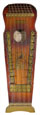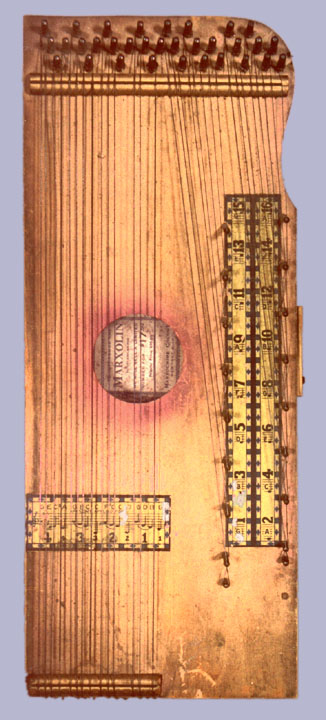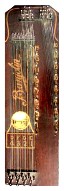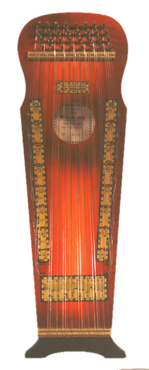 pianolinThe pianolin offers increased versatility with its fully chromatic melody strings and 5 chords. However, as is the case with nearly all the instruments of this family, along with increased versatility comes increased difficulty to play. This instrument's label also often bore the "pianoette" identity, and it sometimes even featured the distinctive pianoette decal. This illustrates the arbitrary manner in which names were often assigned to these instruments by their manufacturers...here we have a case in which the same name was used for one bowed instrument and two different plucked instruments...and maybe for others. For the sake of simplicity, I refer here to the bowed instrument as "pianolin" and the plucked varieties as "pianoette". For more thorough and detailed information on both, consult Kelly Williams's pianolin and pianoette pages, at his site, The Guitar-Zither Clearinghouse. As with violin-ukes above, I have cited Kelly's form reference numbers for the pianolins shown here. pianolins, left to right: