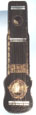 Bosstone CompanyThe first guitar-shaped ukelins were made by the Phonoharp Company of Boston, under the name of its ukelin-producing alter ego, the Bosstone Company. As became the standard, Bosstone guitar-shaped ukelins have two sound holes. The firm used at least three different decals for both the upper and lower sound holes. All are shown below. Curiously, the melody string tuning pins are situated in two orderly rows on some instruments but in four rows (more or less) on others. The latter configuration seems somewhat randomly plotted and requires that the melody strings' bridge be off-center to the left. The chronology of the two configurations is not known. Examples of both are shown. Bosstone Co. guitar-shaped ukelins, left to right: