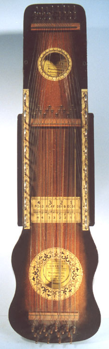 2. Early, transitional form, dark red-brown finish, "Marquetry" sound hole decals, square jack rails and wooden fenders, both bearing the melody string tuning info 3. Early, dark red-brown finish, square jack rails, "Marquetry" sound hole decals 4. Dark red-brown finish, no jack rails, gold pinstriping, double tuning label for chord strings 5. Dark red-brown finish, no jack rails, gold pinstriping, triple tuning label for chord strings 6. Unusual black finish and silver painted bridges, "Cherubs" lower sound hole decal, "Red Morse Code" upper sound hole decal |