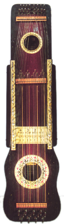 sound clips of this instrument 2. "Morse Code" sound hole decals, jack rails, melody string tuning pins in two rows 3. "Bud" and "International" sound hole decals, jack rails, melody string tuning pins in two rows 4. "Bud" and "International" sound hole decals, no jack rails, melody string tuning pins in four rows 5. "Red Morse Code" and "International" sound hole decals, jack rails, melody string tuning pins in four rows |