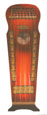 7. Commonest finish; gold base color with diagonal maroon/purple stripes, no soundboard decal; Kelly Williams reports that this form appeared as early as 1934 (dated by receipt.) (Williams: form 3a) 8. Commonest type; gold finish with diagonal maroon/purple stripes, the later form of the "Original Marx Instrument" logo decal; This form appears to have made its debut in 1951, according to Kelly Williams (dated by receipt.) (Williams: form 3b) 9. Red sunburst finish, "Original Marx Instrument" logo decal, black tailpiece; this and the following instrument are from near the time the Marxochime Colony closed in 1972. (Williams: form 4) 10. Light brown sunburst finish, "Original Marx Instrument" logo decal, black tailpiece (Williams: form 4) violin-uke, alternative form