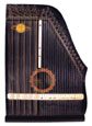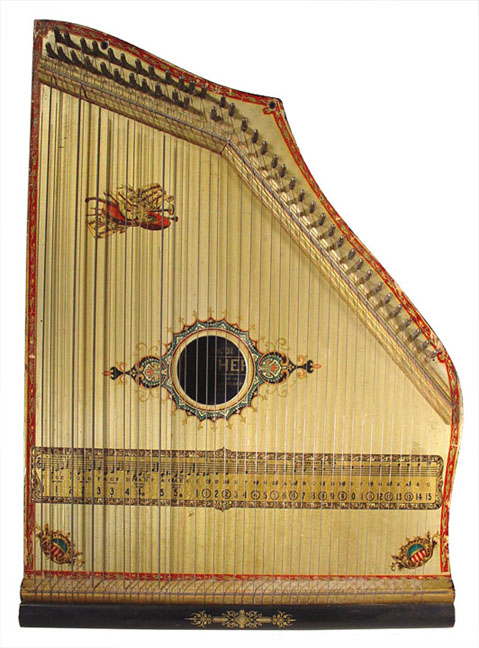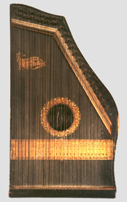 9-chord zitherA 9-chord zither model, the largest of chord-zithers, was also made by Menzenhauer. This model and the 7-chord No. 4 are equipped with two sound holes. |