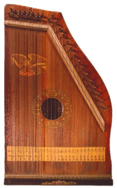 From the purely philosophical standpoint, even if someone could make this reversion invisible, it would not change the fact that it had been altered at one time. This would mean, for example, that it would have to be mentioned in the event of the instrument's sale. Fortunately though, it turned out gloriously, and no one with so much as a scrap of musical intellect would ever want to revert it. The Menzenhauer No. 5 is fully chromatic in the melody section. I find it nearly impossible to play anything much beyond slow single-note melodies on full-chromatic zithers. Pristine examples of the Menzenhauer No. 5 exist. This example was in rough cosmetic condition, battle-worn finish and full of cracks, and I wouldn't have considered altering it if it had been a good representative of its kind. However, its structural condition was amazingly good. So, one choice was to restore it with its full-chromatic melody section kept intact and have a rough example of an instrument I would never play. I didn't find that option to be at all appealing. Another was to give it a more interesting melody section for its 9 chords to support and have a rough example of an instrument that would be a delight to play. But most importantly, I addressed the one question that must always be answered honestly before the alteration of a chord-zither can ever be considered: "What would Wash Phillips do?" Needless to say, I chose the latter plan. Inspired by Phillips's instrument, and after a few experiments, I arrived at a diatonic melody section of 20 octave-tuned pairs. The total melody range is 3 notes short of 4 octaves, nearly twice that of a standard diatonic chord-zither. The accompaniment section offers full support in all of the common guitar/fiddle keys, C, G, D, and A, with a lot of chords to spare. For example, "Devil's Dream" in A with the "book chords," specifically the F#m, is not a problem. (But of course the country chords are better as always.) I gauged the melody strings so that key changes are accommodated by re-tuning to the appropriate accidentals. As it turned out, this was an excellent conversion decision. This instrument is near, if not at, the height of chord-zither functionality. It's about as playable and versatile as a chord-zither can be. It will give its next owner a lot more enjoyment than if it had been restored to its original full-chromatic melody configuration. And of course the sound of the instrument is...well, you can hear it for yourself... | |