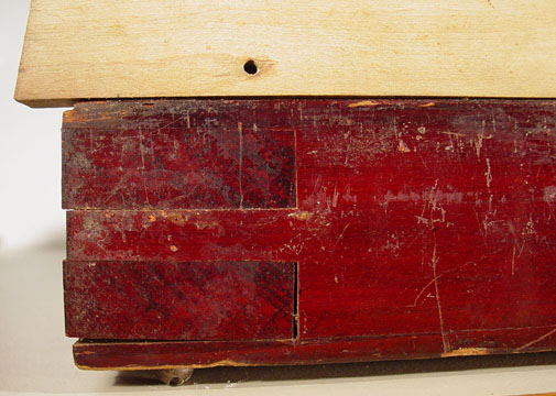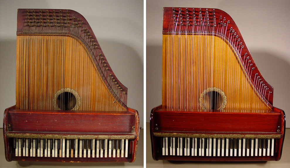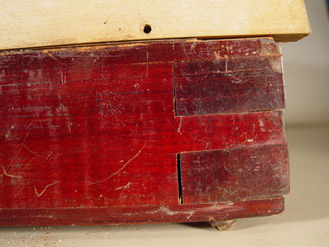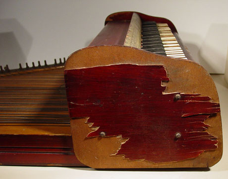 The finger joints of these instruments present a particularly difficult problem in that when they pull apart, large surfaces are not only still joined but joined under force. Then the glue re-sets and the joint is tighter than when it was new. The joints at this Dolceola's upper left hand corner were particularly stubborn, requiring four separate sessions of about an hour each in order to re-align it without damaging the finish. Fortunately, the instrument's cosmetic condition was excellent, and as a result it restored beautifully.