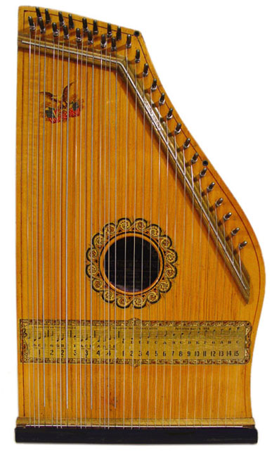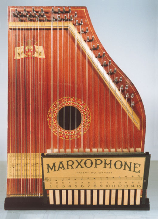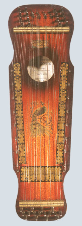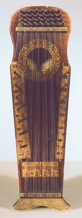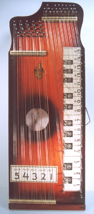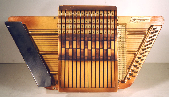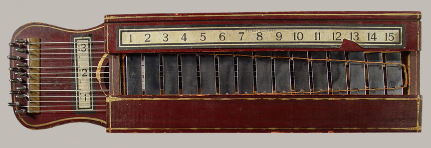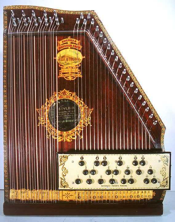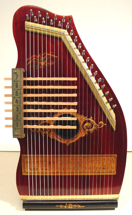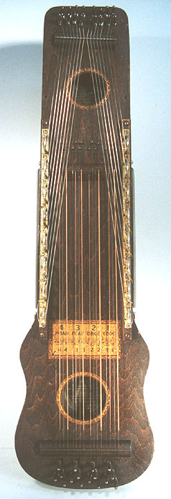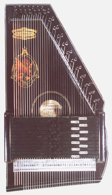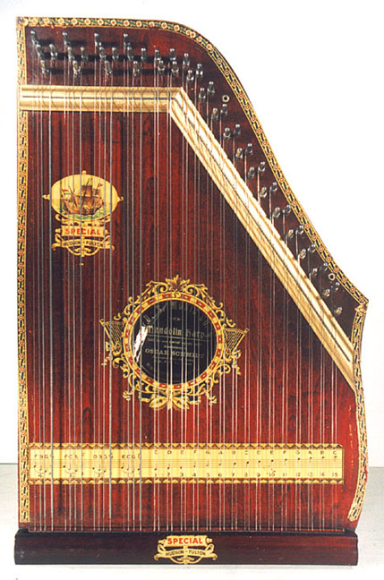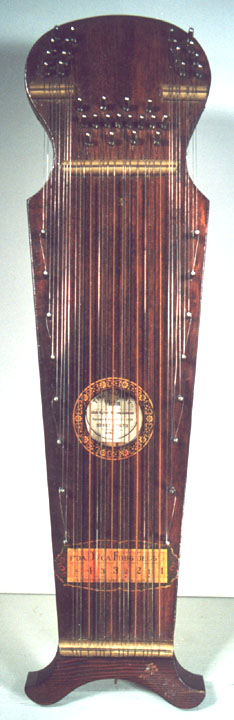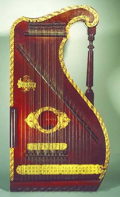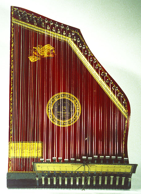 Harps of Gold exhibit catalogHarps of Gold an exhibit concerning Fretless Zithers of 19th and 20th Century American Invention and Manufacture The late 19th and early 20th centuries were productive times in terms of American invention, and it was during this time that the fretless zither came into being. The years from about 1885 to 1930 represent what might be called the heyday of fretless zither production. Aside from offering an entertaining look at a lot of odd antique musical instruments many people have never before seen, the purpose of this exhibit is twofold. It endeavors to answer two fundamental questions: What are fretless zithers? One objective of the exhibit is to offer a look at fretless zithers from the musical standpoint, in terms of their merit as musical instruments. It is not generally known that seemingly endless varieties of them were invented and produced during the years mentioned above; in fact, it seems that the majority of people, including musicians, are totally unfamiliar with them. Though only a fraction of the total number of known varieties is represented, most of the major categories are covered. 53 instruments are displayed, and descriptive text of each gives the locality and approximate chronology of manufacture as well as an insight into the functional intent of the categories and of the individual instruments. A detailed catalog is available for in-house viewing. Where and when were these instruments made? A second objective is to offer a glimpse at the world of the fretless zither from the business standpoint, in terms of its manufacturing history. These instruments represent a facet of American industry that quietly thrived in the period from approximately 75 to 120 years ago and which just as quietly vanished. As with many industries, the challenges presented by the Great Depression and World War II took their toll on the fretless zither business, and evidence of this can be seen in this exhibit. Despite all hardships, fretless zither production continued into the 1970s, and one lone representative, the autoharp, survived and is still in production today. The exhibit is scheduled to run from October 5-30, 2004. Additional features of the exhibit include a talk and a performance on October 17. Those interested in additional information concerning fretless zithers should consult: I am indebted to fretless zithers authorities Kelly Williams and Bob Buzas for some of the information in this catalog. What is a fretless zither? Perhaps the most concise way to begin answering this question is to illustrate what the fretless zither is not, namely a fretted zither. What is a fretted zither? Fretted zither The fretted zither is an instrument native to Germany. It has a fingerboard affixed to its soundboard, like that of a guitar but much shorter in length. Five strings pass over this fingerboard, and the performer plays these strings like a guitar, picking them with the right hand and making various different notes by pushing down on the strings with the left hand. The metal strips running across the fingerboard are called frets. Thus, this is a fretted zither. The type exhibited here is commonly called an "Alpine" or "concert" zither. Another common variety of fretted zither has only four strings and is played with a violin-type bow. 1. Alpine zither, Lyon & Healy (Washburn brand), American, c. 1900 Fretless zither On the other hand, the fretless zither has no fingerboard and thus no frets. Each of its strings make only one note and can not be manipulated to make more than one because there is no fingerboard to provide the means to do this. Plucked and hammer-struck instruments Fretless zithers without chord groups Simple all-melody zithers This instrument is an example of a type that appears to have preceded the family of instruments represented by the rest of this exhibit. They are plain all-melody zither-type instruments, but of a specific form. Though such instruments doubtless existed for centuries before the 1800s, there is a small group of simple zithers that are characterized by the letter names and/or numbers of the strings being imprinted in an arc across the soundboard. Given their abundance, it is likely that they were produced in America, probably in the 1860s-1870s. 2. Simple all-melody zither, 20 strings, c. 1870 The simple all-melody zither was re-invented in many different body styles throughout the years, with variants still being introduced as recently as the 1950s. An example of a later form is exhibited. Gideon's Harp The Gideon's Harp (also sold as "Harpolute") is a simple 20-string all-melody zither. It was produced by the Phonoharp Company around 1910-20. Functionally, it is identical to Exhibit No. 2, which dates from several decades earlier. Autoharp The history of the fretless zithers featured in this exhibit that were produced by the major manufacturers begins with the first deviation from the simple all-melody zither, the autoharp. A brief chronology of American autoharp manufacturers is given below. This historical sketch follows only the direct successors of the first American autoharp manufacturer. Recent years have seen a number of autoharp producers that are unrelated to this lineage. c. 1885-1893 American autoharp production began at the shop of C.F. Zimmermann in Philadelphia, PA. Mystery shrouds the actual origin of the autoharp. There exists evidence to the effect that the creator of the instrument was not Zimmermann but rather a German inventor named Gutter. Nonetheless, in 1885 C.F. Zimmermann began to manufacture America's first autoharps. 1893-99 In 1893, Zimmermann sold the autoharp to Alfred Dolge, a piano parts manufacturer of Dolgeville, NY. It is said that at the peak of its production the Dolgeville factory manufactured 3000 autoharps per week. Several new models were introduced by the Dolgeville firm. Dolge built an impressive business empire, but it toppled in 1899. No autoharps were produced in America for th