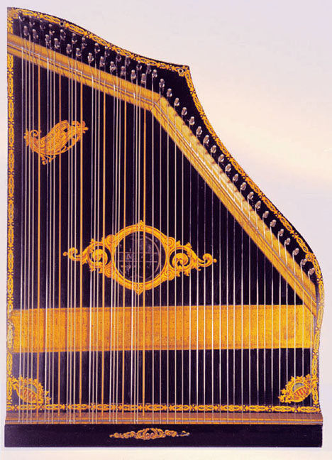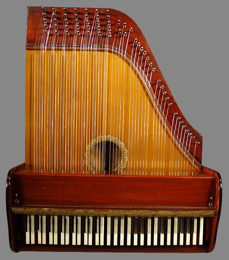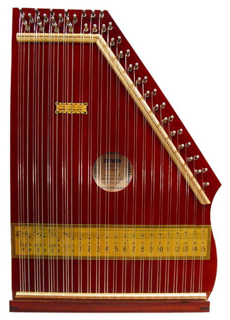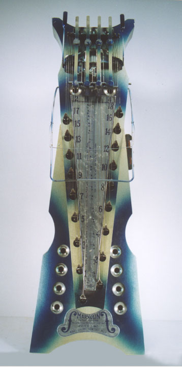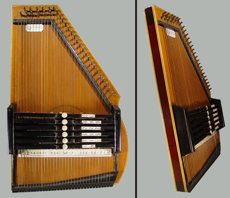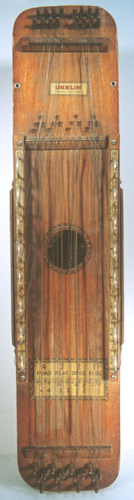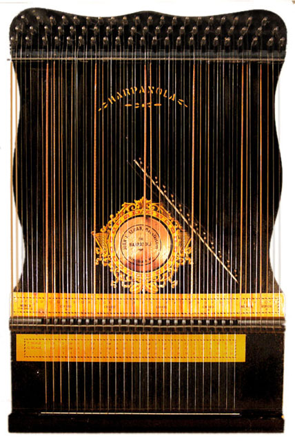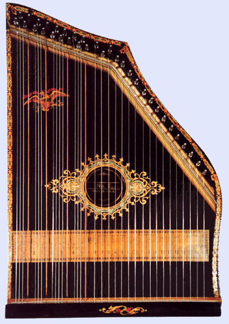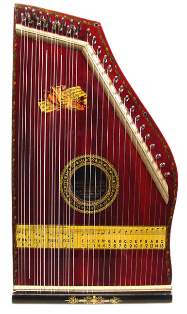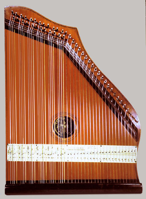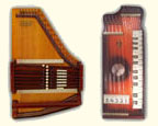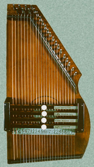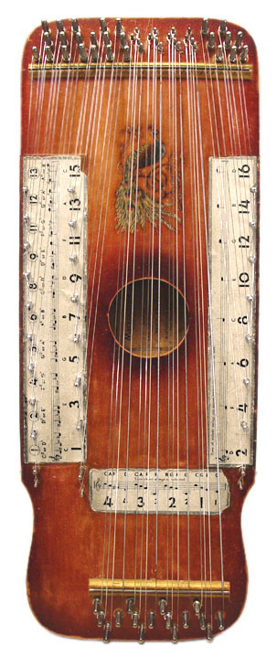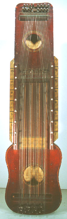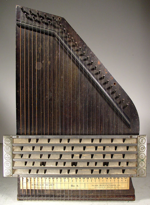 Harps of Gold exhibit catalogHarps of Gold an exhibit concerning Fretless Zithers of 19th and 20th Century American Invention and Manufacture The late 19th and early 20th centuries were productive times in terms of American invention, and it was during this time that the fretless zither came into being. The years from about 1885 to 1930 represent what might be called the heyday of fretless zither production. Aside from offering an entertaining look at a lot of odd antique musical instruments many people have never before seen, the purpose of this exhibit is twofold. It endeavors to answer two fundamental questions: What are fretless zithers? One objective of the exhibit is to offer a look at fretless zithers from the musical standpoint, in terms of their merit as musical instruments. It is not generally known that seemingly endless varieties of them were invented and produced during the years mentioned above; in fact, it seems that the majority of people, including musicians, are totally unfamiliar with them. Though only a fraction of the total number of known varieties is represented, most of the major categories are covered. 53 instruments are displayed, and descriptive text of each gives the locality and approximate chronology of manufacture as well as an insight into the functional intent of the categories and of the individual instruments. A detailed catalog is available for in-house viewing. Where and when were these instruments made? A second objective is to offer a glimpse at the world of the fretless zither from the business standpoint, in terms of its manufacturing history. These instruments represent a facet of American industry that quietly thrived in the period from approximately 75 to 120 years ago and which just as quietly vanished. As with many industries, the challenges presented by the Great Depression and World War II took their toll on the fretless zither business, and evidence of this can be seen in this exhibit. Despite all hardships, fretless zither production continued into the 1970s, and one lone representative, the autoharp, survived and is still in production today. The exhibit is scheduled to run from October 5-30, 2004. Additional features of the exhibit include a talk and a performance on October 17. Those interested in additional information concerning fretless zithers should consult: I am indebted to fretless zithers authorities Kelly Williams and Bob Buzas for some of the information in this catalog. What is a fretless zither? Perhaps the most concise way to begin answering this question is to illustrate what the fretless zither is not, namely a fretted zither. What is a fretted zither? Fretted zither The fretted zither is an instrument native to Germany. It has a fingerboard affixed to its soundboard, like that of a guitar but much shorter in length. Five strings pass over this fingerboard, and the performer plays these strings like a guitar, picking them with the right hand and making various different notes by pushing down on the strings with the left hand. The metal strips running across the fingerboard are called frets. Thus, this is a fretted zither. The type exhibited here is commonly called an "Alpine" or "concert" zither. Another common variety of fretted zither has only four strings and is played with a violin-type bow. 1. Alpine zither, Lyon & Healy (Washburn brand), American, c. 1900 Fretless zither On the other hand, the fretless zither has no fingerboard and thus no frets. Each of its strings make only one note and can not be manipulated to make more than one because there is no fingerboard to provide the means to do this. Plucked and hammer-struck instruments Fretless zithers without chord groups Simple all-melody zithers This instrument is an example of a type that appears to have preceded the family of instruments represented by the rest of this exhibit. They are plain all-melody zither-type instruments, but of a specific form. Though such instruments doubtless existed for centuries before the 1800s, there is a small group of simple zithers that are characterized by the letter names and/or numbers of the strings being imprinted in an arc across the soundboard. Given their abundance, it is likely that they were produced in America, probably in the 1860s-1870s. 2. Simple all-melody zither, 20 strings, c. 1870 The simple all-melody zither was re-invented in many different body styles throughout the years, with variants still being introduced as recently as the 1950s. An example of a later form is exhibited. Gideon's Harp The Gideon's Harp (also sold as "Harpolute") is a simple 20-string all-melody zither. It was produced by the Phonoharp Company around 1910-20. Functionally, it is identical to Exhibit No. 2, which dates from several decades earlier. Autoharp The history of the fretless zithers featured in this exhibit that were produced by the major manufacturers begins with the first deviation from the simple all-melody zither, the autoharp. A brief chronology of American autoharp manufacturers is given below. This historical sketch follows only the direct successors of the first American autoharp manufacturer. Recent years have seen a number of autoharp producers that are unrelated to this lineage. c. 1885-1893 American autoharp production began at the shop of C.F. Zimmermann in Philadelphia, PA. Mystery shrouds the actual origin of the autoharp. There exists evidence to the effect that the creator of the instrument was not Zimmermann but rather a German inventor named Gutter. Nonetheless, in 1885 C.F. Zimmermann began to manufacture America's first autoharps. 1893-99 In 1893, Zimmermann sold the autoharp to Alfred Dolge, a piano parts manufacturer of Dolgeville, NY. It is said that at the peak of its production the Dolgeville factory manufactured 3000 autoharps per week. Several new models were introduced by the Dolgeville firm. Dolge built an impressive business empire, but it toppled in 1899. No autoharps were produced in America for th