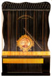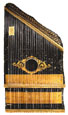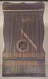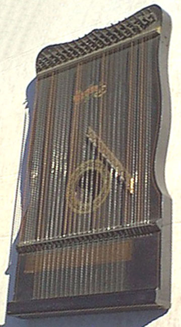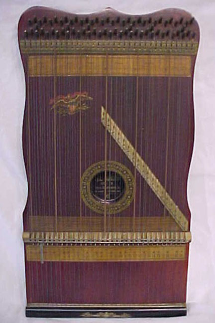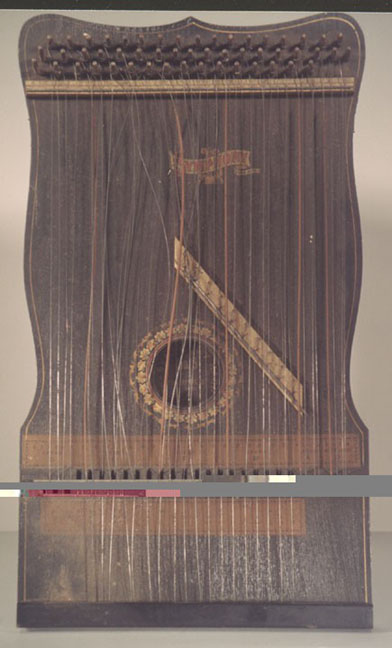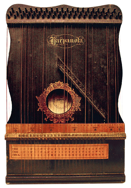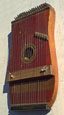 The big brother of the harp-guitar-zither, the "American-Italian harp" is another left-handed zither. It has 6 chords and a fully chromatic 25-string melody section. The accompaniment strings of both this instrument and the harp-guitar-zither travel their length through the inside the body cavity and are visible through the sound hole. Both are products of the Phonoharp Company.