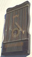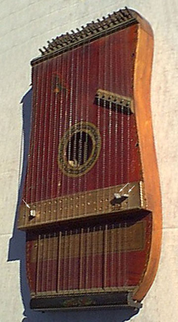The harp-guitar-zither has 4 chords and 19 melody strings. It is configured in reverse of the instruments above, in that it has the melody strings at the higher level and the accompaniment strings at the lower. In fact, this zither would accommodate a left-handed player nicely. Another feature unique to this instrument is the perforated bridge, which accommodates "sharping cams" (white arrows in photo).
