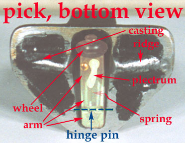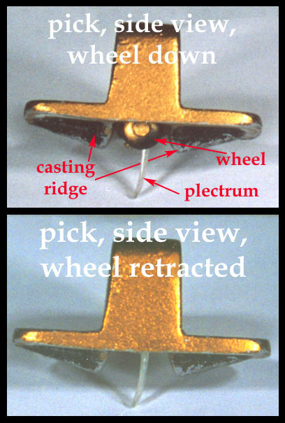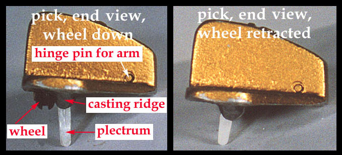 side view of pickNext, we are looking at the side view of the pick, from the wheel end of the arm. First, it is shown with the arm/wheel/plectrum down, in which position it would be plucking a string. In the second image, the arm/wheel/plectrum is retracted, in which position it would not be plucking any string. When the arm is in retracted position, the strings are out of the plectrum's reach. ![]() end view of pickNow we see the end view of the pick, again in both "engaged" and "retracted" positions. Here we get the end view of the casting ridge and the hinge pin for the arm.