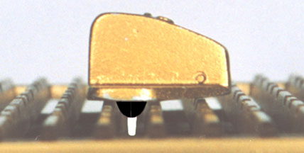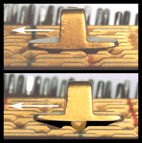But in the second image, the wheel falls into one of the rounded notches, and the arm is forced downward by the spring. This also lowers the plectrum, enabling it to now reach and thus pluck the string directly below this particular rounded notch in the rail. Incidentally, I raised the body of the pick up off the rail a little so you could see better how it works; it would normally be riding on the rail, as in the top photo. end view of pick in actionAnd last, we have the end view of the pick in playing position. ![]() |