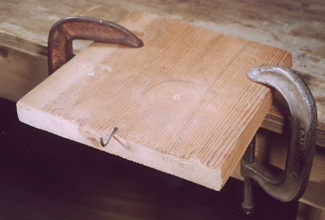 making the jigMaking the jig could hardly be more simple. The steps are: 1. Drive the nail into the board, near one end. 2. Bend the nail into the shape of a crank. The jig is finished. All that remains to do is to clamp it to the top of a work bench or table. Note: You want to use a nail just larger in diameter than the hitch pins of the instrument you're stringing. If you use one that's smaller, you probably won't be able to get the string on the hitch pin, which would mean you would have to do it all over with a larger-diameter nail. So make sure your nail is big enough. At this point, you should have something that approximates this: ![]()