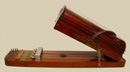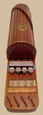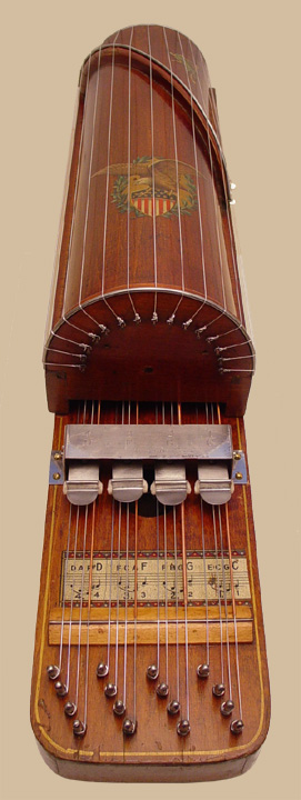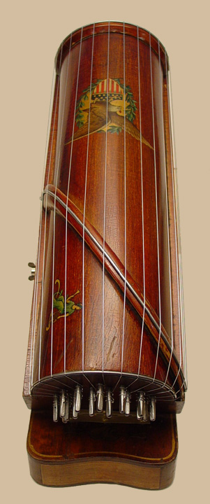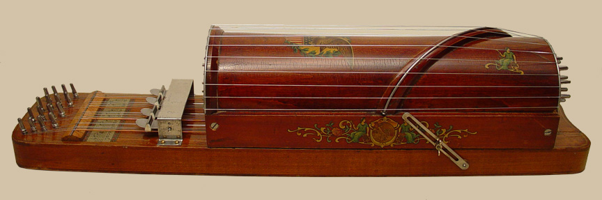 The part of the instrument that accommodates the accompaniment section resembles a rectangular ukelin and serves as a base. The semi-cylindrical melody section is hinged to the base at one end. To ready the instrument for playing, the wing nut on the side is loosened, the entire melody section is raised, and the nut tightened, locking it in the raised position. The reason for this feature is to allow for bow clearance when playing the strings nearest the bottom.