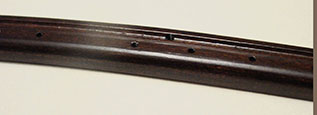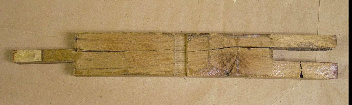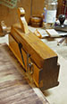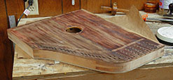 So, a Dolceola. Well, it doesn't look to be in TOO bad a shape, right? Ha! To quote the teachings of Waylon..."WRONG!" The keyboard part was actually in good condition, but the zither part was a MESS! Oh well, it's almost a hundred years old and it looks like it's been thrown out the door after its owner a few times. My sense is that this latter wasn't the Dolceola's fault, so let's see if we can bring the poor old thing back to life. As our documentation opens, all the internal work has been finished and the box is back together. This involved making new braces, a new back, and 3 of the 5 pieces of the frame. Let's start with a brief review of the damaged parts, in no particular order. First up, here's the short side of the frame. As you can see, it was a few grain lines from the two big cracks meeting in the middle and leaving it in two pieces. Here's the head end of the long rail. Hey, isn't there supposed to be a tenon there?! Despite its mass, the tail block was busted like this in a couple of places. Here's a shot of the inside of the old back. Yes, the large script lettering that runs the length of middle piece does in fact say "Honeydew". It’s a piece of a melon crate! In all fairness though, it looks like it's probably not original, and for that matter it's not a particularly unacceptable material for the purpose, but it's still entertaining. As far as damage, notice the crack at the far left; that's where the braces had come through the back and were seeing daylight. Speaking of braces and seeing daylight, get a load of this. Here's one of the braces, against a steel straight-edge. That's hard maple, and that's a lot of swag. The bridge suffered from missing wood in nearly all of the chord groups. The pins slant toward the direction of the lateral force of the strings, and there is no reinforcement under the bridge on the inside...the bridge pins go through the top and that's IT. The missing wood would leave the pins free to move at the ends that show, pivoting at the point where they go through the top...gee, that wouldn't crack the top...would it? (And yes, it did.) Needless to say, I reinforced the area under the bridge before putting it back together. But the bridge had another just-as-serious problem. It was separated at the bend.