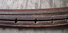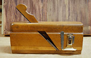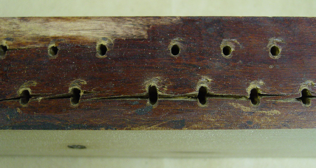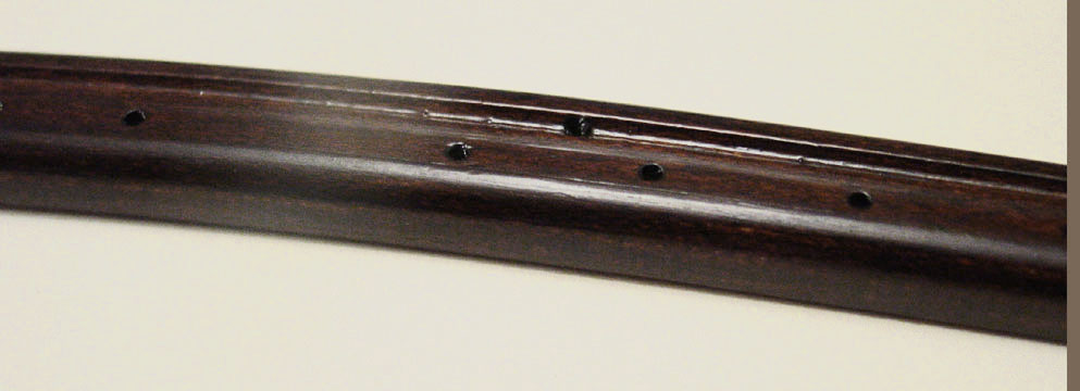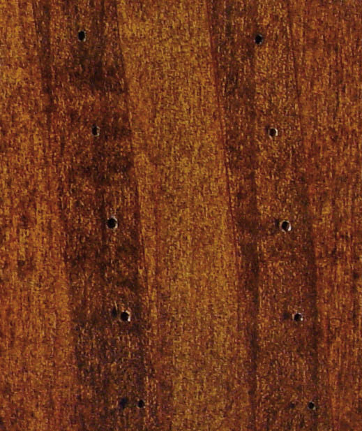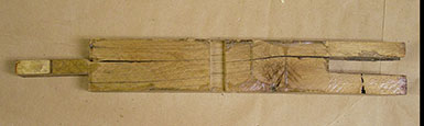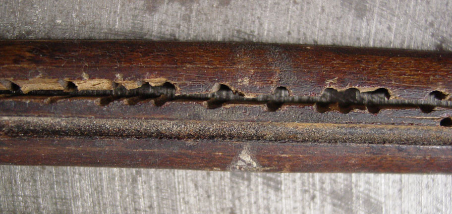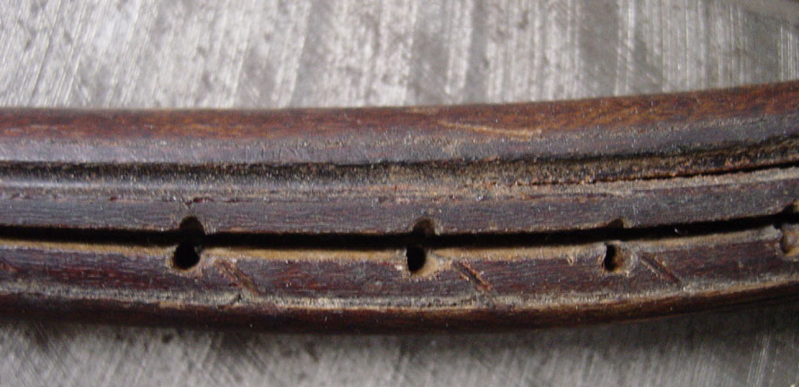 The fillet for the tail wire had to be re-cut. I got to use one of my old-time tools for this. (I love it when I get to use them!) I keep them in good tune and they work really well. I had one that was the perfect tool for the job, a "moving filletster". This plane has a skewed iron for cutting across grain, a little slicer that travels ahead of the iron to prevent the side of the fillet from getting all torn up, and both width and depth stops, to stop you when you're there. You can't go wrong with Movin' Phil! Here's a shot of this great old tool at rest. ...and in action. Here's a close-up of his work. Not bad for a couple of minutes' work that involved no machines. So finally, here's an unobstructed view of the top at this point. Looks like hell, doesn't it? Oh, I'm dying to plane it and get rid of that old finish, but there's work to be done before I get to do that. As you can see in the image above, the area of the top around the chord string pins is a mess. The pin holes don't line up with those of the block, and lots of little pieces are missing. The wood of the top around all the melody string pin holes is wallered out too, but at least they are in alignment with the holes in the block.