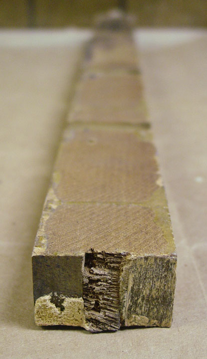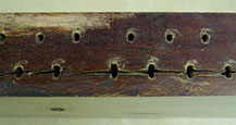 So I undertook to inlay strips of new wood, one per chord, and re-drill these holes. To begin with, I chiseled away just down through the top for the patches. But I knew I'd never hit every one of the 35 pin holes in the block dead-center, and that if I didn't I'd have egg-shaped holes in the block. This would obviously be bad; not only would it make it hard to keep in tune, but if the gap was on the bridge side, it would set the stage for the pin pulling forward and breaking out the little piece of wood between it and the next pin, like it did before.