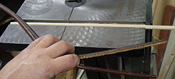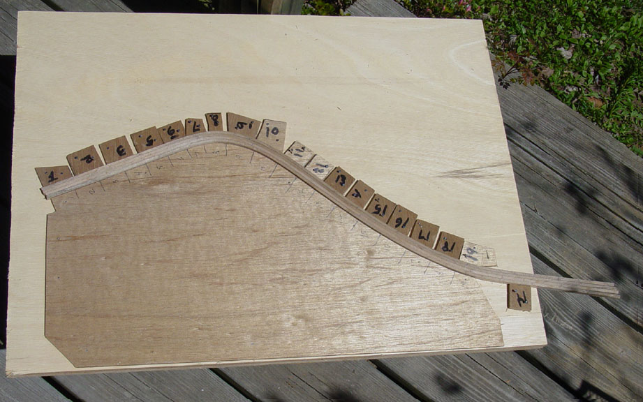 Doesn't seem serious? That's what I thought too: "Big deal; I'll squeeze it back together." Again, enter Waylon. Somehow it was badly twisted...I mean as badly as I am for tackling this project! Getting the two laminations to meet up required misaligning the two halves by about 3 inches at the end. After considerable thought, I pronounced the old bridge unsalvageable. It just made more sense for the long haul to make a new one. So I planed up some 1/8" x 5/16" x 29" hard maple strips, and went about the matter of trying to bend them.