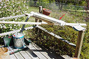 I tried s-l-o-w, patient bending with dry heat, using a fully regulation fiddle rib bending iron, and even sandwiching the strip between that and a hot flat-iron. 20-30 minutes later, I'd gained about 5 degrees of curvature, and a few minutes after that, that sickeningly as-irreversible-as-pulling- the-trigger sound..."plik". #$^&*(%@!!! Yes, I broke it. It became evident that bending 1/8" thick hard maple required different tactics from the dry heat method used to bend c. 1/32" thick fiddle ribs. So...off to the web to learn the finer points of bending wood. Following two or three sets of directions which consistently outlined the general direction I needed to head, here's my new steam box! Yes, that's a 5-gallon galvanized gas can, a Coleman camp stove, some radiator hose, some PVC, and some dowels that form a rack for the wood to sit on. I think you can imagine how it works...it just makes lots of steam. The one detail that's not so obvious in the picture is the 1/2" dia. vent hole (red arrow) where the steam (faintly visible) comes out. The strips were inside it when this shot was taken.