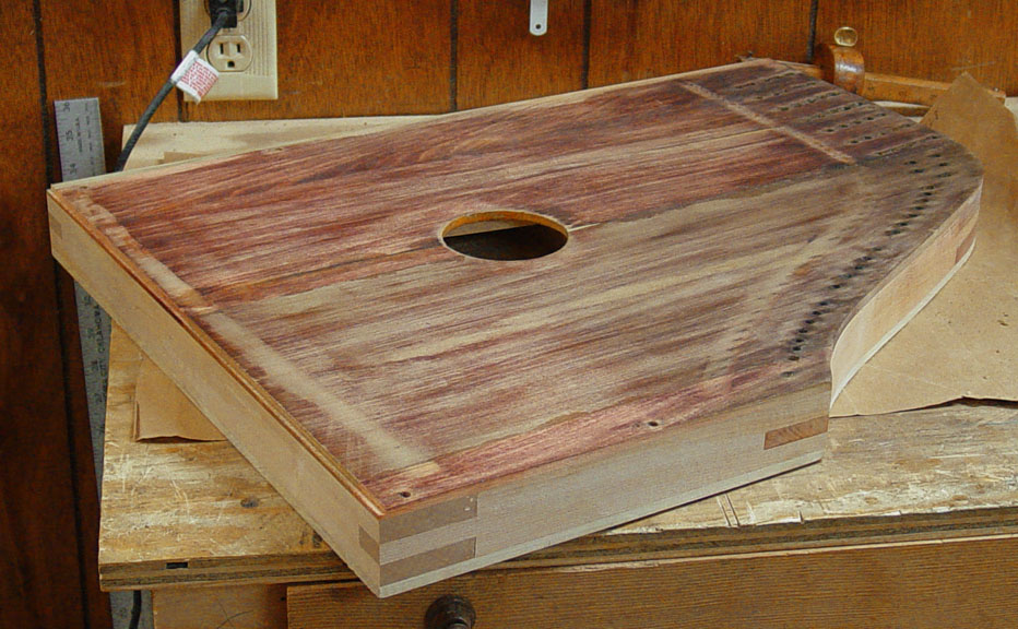 So does this thing work? I admit I had my doubts. But I have to say, it appears that it *does* actually work. After an hour in the sauna, the strips of hard maple (determined by the USDA to be THE WORST wood for bending) conformed to the ready-and-waiting mold quite nicely. I let it spend the day in the sun to dry, then glued it up. After a day in the mold, I took it out, wondering if it would spring back out as straight as an arrow, or at least enough to really mess things up. But no, I was pleasantly surprised; it didn't straighten out...any, at all. Here's a shot of it in the mold, just after bending. Now as for the dolc. proper, the body is all back together. Here's a series of shots in which I took a trip around it, showing the new frame pieces and joints. Glimpses of the new braces are visible too. The tail view from the treble side... ...from the bass side...