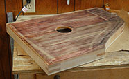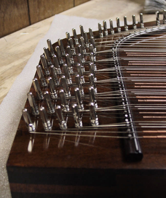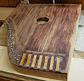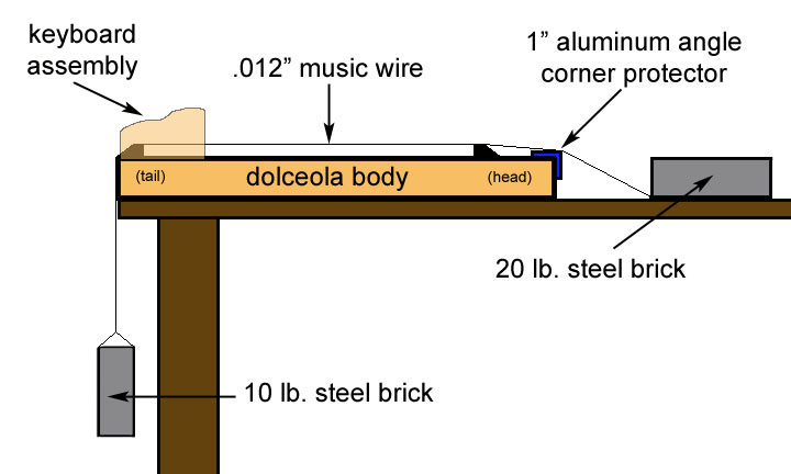 So I filled the pin holes with dowels. I used epoxy for the adhesive, since it fills gaps. Once it was all set up, I leveled them off flush with the block. I figured this way it wouldn't matter (as much, anyway) if I missed the original pin holes in the block by a little with the drill; at least there wouldn't be a void down inside there. I tried a pin in a couple of the melody string holes, and the fit was too loose to suit me. I thought I'd better treat them the same way as well, while I was at it. Finally, the patches are laid in. They fit tightly enough that I had to clamp them in, which yielded the hydraulic effect. I could feel them being supported by the cushion of (non-compressable liquid) glue, then finally it would find a way out, and sometimes it had some force behind it when it did. So yes, it looks like I got a little carried away with the glue. Now...finally...it was time to plane the top. It was like Christmas...it seemed like I'd been waiting forever to clean up that old top, and then it was done before I knew it. I brought my jack plane to surgical sharpness and went at it. The first trip across did away with most of the old finish, the second got the rest. Then I "cruel lighted" it, as I call it. I turn out all the lights and sidelight the work with a single lamp, so it shows every ridge the plane has left. Then I start backing the iron up, go a trip across, then back it up more, until finally it's taking an almost imaginary amount of wood. I won't sand the top, or even scrape it. I saw some micro-photos once, showing wood that had been planed, sanded, and scraped, and it convinced me that wood dressed with a super-tuned plane is at its most reflective and alive-looking. This thing can use all the life it can get! Besides that, sanding abrades the soft grain more than the hard grain, leaving the latter raised, and it rounds off edges (at least when I do it), both of which I find objectionable. So I hardly ever use sandpaper on wood. Anyway, after about 5 long-awaited minutes of pure joy, here's what I had. Now it was time to mount the new bridge and the keyboard action to the body and locate all the bridge and hitch pins. I forgot to get a photo of my set-up for this, but I included a rough sketch of it below. It amounted to a piece of .012" music wire, tied at one end to a large steel brick (about 20 lbs.) that sat at the head of the instrument on the bench. The wire ran the length of the instrument, off the tail end, and off the end of the bench. From it dangled another smaller steel brick (about 10 lbs.), to keep the wire tight and straight. I temporarily mounted the keyboard assembly (shown in semi-transparent "see-through" view in the image). Then I sighted from the tail end, aligning the wire with each hammer and damper and marking the locations of the bridge pins on the bridge and the hitch pins on the tail block. 46 keys/60 strings worth of this only took about...oh...forever! Well, it seemed like it, anyway. At any rate, locating both ends from scratch wasn't a quick little job. Once that project was done, it was time for another long-awaited event, namely finishing. This included the new sound hole decal I had made in the computer from a photo of the old one and then bonded to foil. I admit I probably took the liberty of brightening up the colors a bit, though those of the old one may have been faded. But then, at this point, am I worried about absolute adherence to the original? Over half the zither body is new! On the other hand, I won't be refinishing the keyboard housing because unlike the instrument's body, it wouldn't improve it. The finish is in plenty good enough condition to keep, so it stays. The finished wooden parts of the housing are of a deep brown color. I was pretty careful in trying to match the color, and it came out pretty good. Here's a shot of the freshly finished zither. The only close-up of the new decal that came out in focus was the one where the flash went off independently. Oh well, you get the idea. Here's a stretch of the new bridge after finishing. I shaped it with the simplest of tools, just pieces of spring steel shaped into scrapers, and they worked great on the hard maple. I scraped in the trough for the bridge wire first, while the sides were still flat, then rounded off the corners. It's pretty well identical to the original bridge. And here's a micro-inspection of the chord string pin patches. Well, once the 180 pins were all in place, it was at long last time to start putting the wire to this box. Incidentally, as you may have noticed, I decided to wait and drill all the pin holes after finishing. It turned out to be a good plan. I used a new, sharp “pilot point" bit, and the holes are slick as a whistle...not a trace of tearing out around the rims, and no slop whatsoever around the pins. I also decided to drill them at a slant, like a "normal" zither. They were set square originally, and I didn't like the look of it. Does anybody know why zither pins are usually slanted? Is there some mechanical advantage to setting them slanted, or is it just for appearance's sake? Is there some mechanical disadvantage to setting them slanted? (Please say no!) Well, for better or worse, here's the first look at the Dolceola with the strings installed, showing the now-slanted tuning pins. And finally, here’s a full-view shot of the finished Dolceola. This project consumed nearly every scrap of my spare time for two months, but I suppose having a nice, functional Dolceola out of the deal justifies this expenditure of time and effort. One thing’s for sure; I don’t ever care to see the inside of another one!