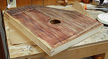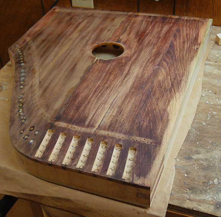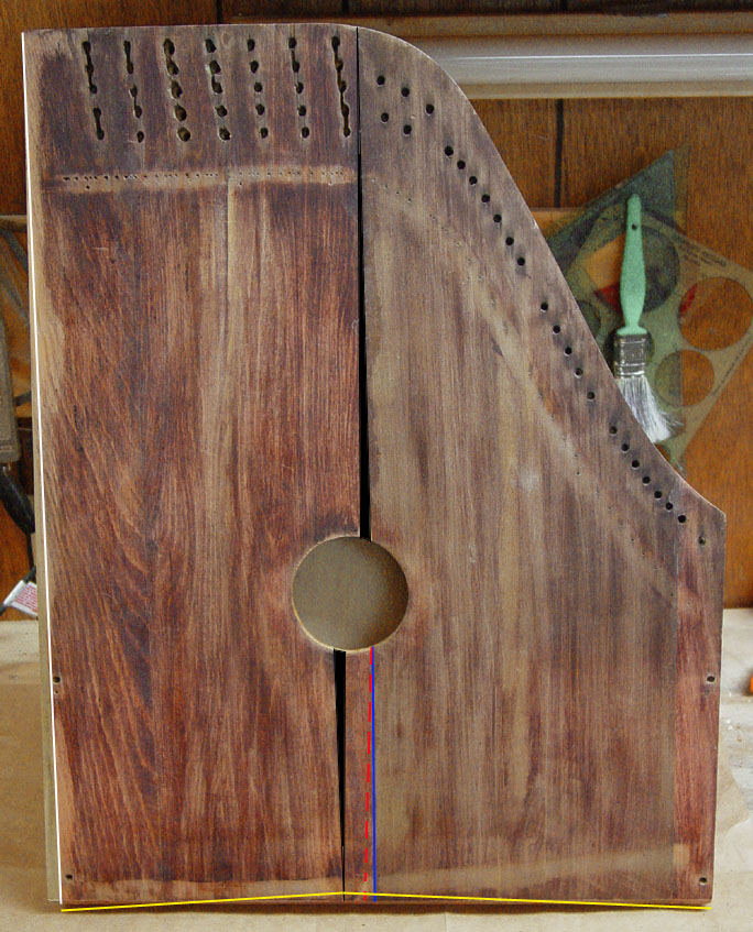 Here's a shot of the new back. It's 1/4" poplar, same as the original. I haven't planed it yet (or "cleaned it up", as the aulde-time carpenters would have said), but that'll only take a minute; not a big job. The top of this instrument presented some interesting challenges. In the following paragraphs, I refer to the image below.