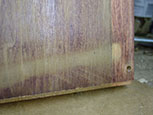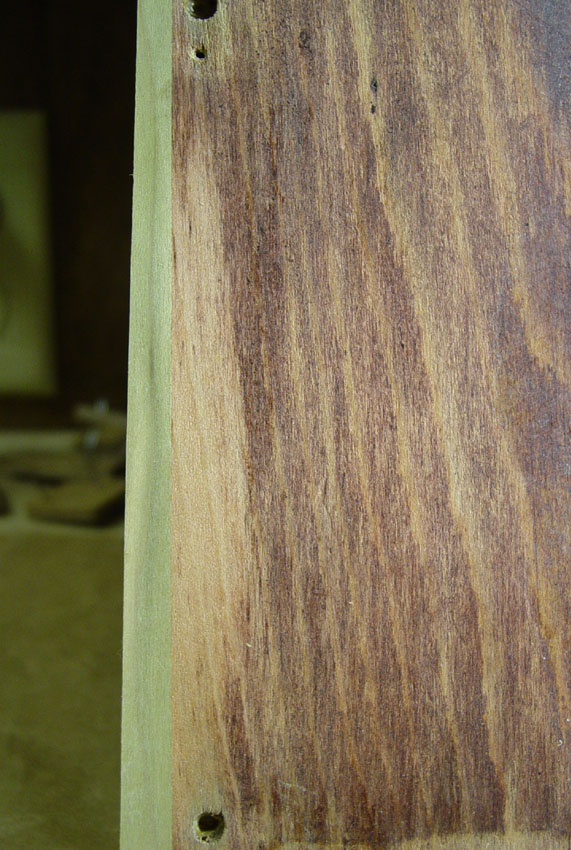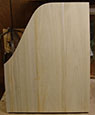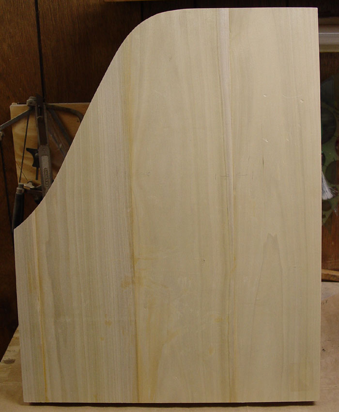 Now while this bit of plastic surgery did miraculously almost erase the big crack, it also created a couple of new problems. First, the top was now narrower at the bottom than when it left Toledo (white line). This is a big deal because the action has to fit, and its width isn't adjustable. So I had to add a wedge-shaped piece of wood on the long side. Here's a close-up of it. Also, the tail edge of the top was now swallow-tail-shaped (yellow line). The drawing is exaggerated, but the actual measurement of the discrepancy was a full 1/8"...couldn't ignore that; it definitely needed to be reckoned with.