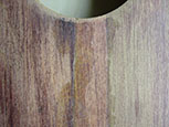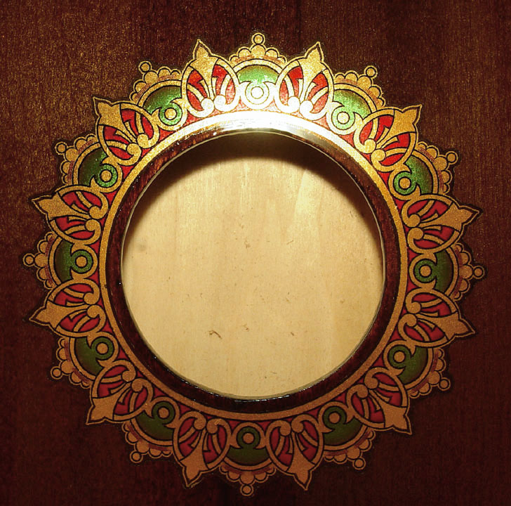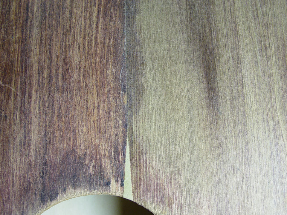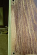 I realized that when I took this little piece out, the halves of the long top part of the big crack mated back together nicely. And when I put this piece against the shorter bottom part of the crack, the same was true. So I decided to plane the already-straight joint edge of this small piece at an angle that would make everything come back together (red dotted line). Both the angle and the amount removed had to be perfect, so I took the precaution of making sure I was in perfect mode when I did it. (Actually, I settled for really, really careful mode.) Here are a couple of close-ups of the results, from where the crack was worst. It doesn't necessarily look like it in the photos because of the old finish and excess glue, but the halves are together tightly. The piece of new wood in the image of the top part of the crack was to fill a chip, not the crack itself. Here's the scene at the top of the sound hole... ...and the bottom.