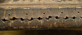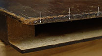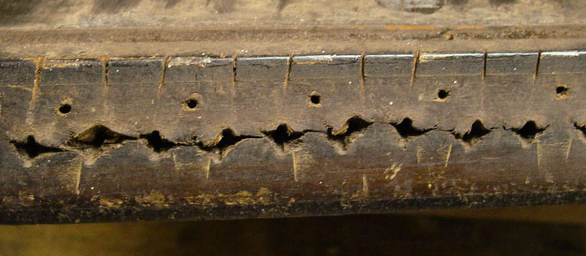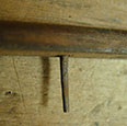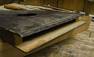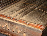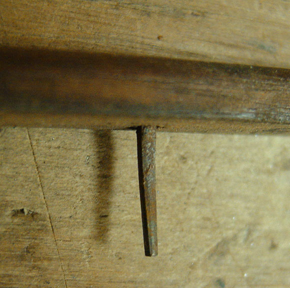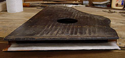 But also, the block didn't look to be made of hard maple as it should be. It could be that it was rotten, but it didn't look like it had been wet. Besides, if it had been wet enough to have rotted, the joints would be wide open. As can be seen, they were as tight as the day this instrument was made. So, I was faced with a treatment decision. After considerable thought, I decided that the tail block must be replaced with a new maple one. After more thought, I proceeded with my plan for removing the old block.