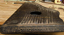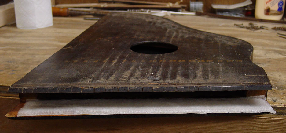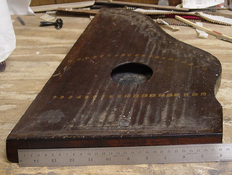 However, it had one significant problem, namely that the tail block was severely cracked. This was in part the result of the unwise practice of using one piece of wire to make two melody strings, which puts undue stress on the hitch pins. This can crack even hard maple hitch blocks.