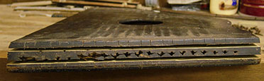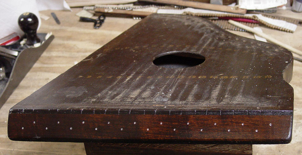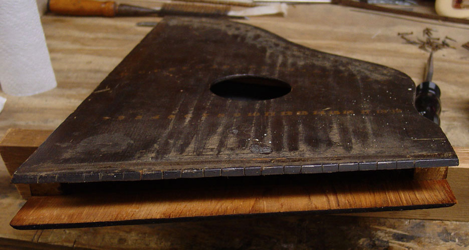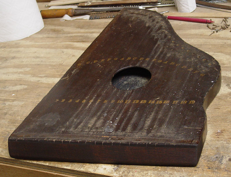 The instrument at hand is a simple all-melody fretless zither of a type believed to be from the 1860s or 1870s. These early fretless zithers are characterized by their having the tuning information and string numbers imprinted in an arc across the soundboard. These zithers also quite often have the tuning pins set into the edge of the frame, a structural and functional error. Fortunately the subject of our restoration project has the tuning pins set into the block through the instrument's front as came to be the usual. There is no head bridge. Instead, screws serve as individual bridges for each string. It is interesting to note that an idea similar (though not identical) to this was adopted by Oscar Schmidt Company and incorporated into the design of certain autoharp models over 100 years later. Here is a look at the instrument as we began its restoration. As this type goes, this one's condition was quite good.