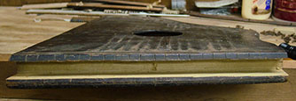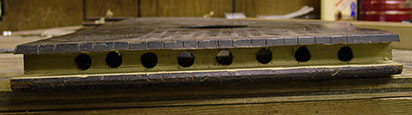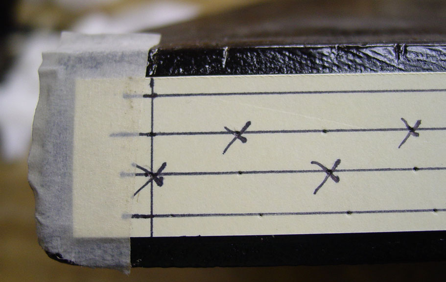 I then measured 3/8" from one of the long lines and cut the paper along that line. This was to be the edge I would align with the joint of the instrument's top and the tail block. The paper was also cut approximately 3/8" from the other long line. Length-wise, I cut the paper to a length where I could tape it to the face of the block. With an awl, I punched holes in the block at each of the marked holes in the paper.