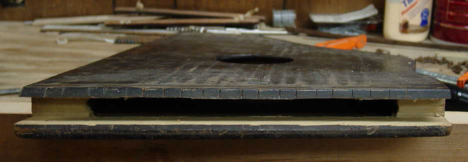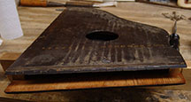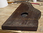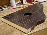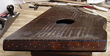 Next evening, the zither was removed from the clamps and the new block was planed flush overall. I had to round off the corners to flush it up with the worn corners of the top and (to a greater degree) the back.