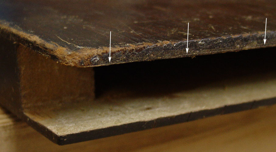 Here is a close-up look, showing the thickness of the remaining wood of the block. The arrows indicate the joint.