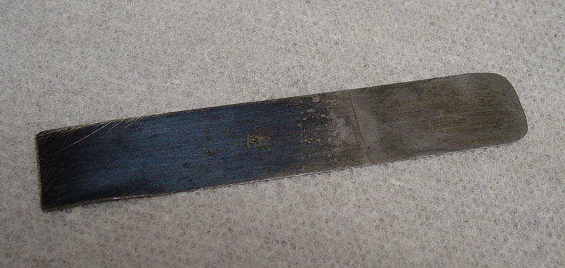 After two such applications, the glue had softened to the point that the remains of the old block were ready to come out. I used this tool to slide in under it. It's a battle-worn piece of .010" spring. I mainly use it for administering glue in places where no other tool can go, but it worked quite well for the purpose at hand.