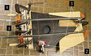 The following evening, the new block was made up, carefully fitted, and installed. I have provided a numbered image with text at the linked page, as it's a little confusing to tell what's going on here. 1. I always clamp to a "clamp board", a board that spans the whole surface (or near to it) of the back . Its purpose is to provide an overall flatness reference, to prevent the block from shifting upward or downward, as can happen if it is glued "in mid-air." It is a piece of 3/4" cabinet-type plywood (smooth face, no "footballs", and flatter than construction grade .) It is covered with wax paper so I don't glue the zither to it. As I was gluing only at the tail end, I didn't need a clamp board that fit the zither's outline exactly, and since I'll probably never restore another one of these, I preferred not to make a new one for it if I could help it. The one I used was for a No. 73 autoharp, and it worked fine. I had to situate the zither a couple of inches away from the tail end of the clamp board for it to be wide enough, and the exposed couple of inches of it can be seen in the photo. 2. As mentioned, the entire instrument is clamped to the clamp board, and that's what these two clamps are for. 3. In addition to merely clamping the top and back to the new tail block as the 4 clamps at the tail end in the image are doing, the block must also be clamped inward. For this I use a thing I call a "clamp dog." Its purpose is to provide an edge parallel to the tail end of the zither to clamp against. This prevents the block from shifting left-to-right, i.e., in the direction of the instrument's width, which it will do if clamped against an edge not parallel to it. Clamp dogs are also usually made from 3/4" plywood, though 1/2" will normally do in a pinch. 4. Here the excess wood of the new block itself can be seen protruding from the zither's tail end.