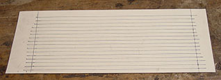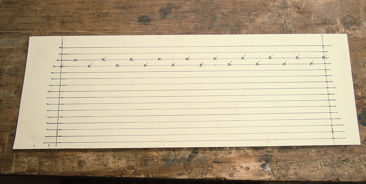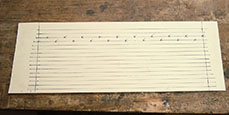It's not a good idea to situate the hitch pins all in one straight row in the block because they can collectively assume the role of a wedge and split the block. It would be a shame to split our new block; this zither's been there, done that. They should be situated in two or sometimes three rows if there are a lot of them and/or they're crowded. This zither has only 20 wide-spaced strings, so two rows is plenty. I measured the thickness of the block, and it was just (again, exactly a whisker) over an inch. So I figured if I started at the center point, 1/2", and spaced each row 1/8" from it, the rows would be 1/4" apart and each would be 3/8" inward from the edges of the block's thickness. Those measurements all seemed good, so I made a number of parallel lines on the manila, starting 1/4" from one edge and continuing across the width of the paper. We will call these the "long lines." You'll see in a minute why I made so many. The distance between the two lines perpendicular to those (which we'll call the "short lines") was the overall distance between the two outermost strings, the measurement we divided by 19. It's a good idea to keep all these lines both as square and as parallel as possible.