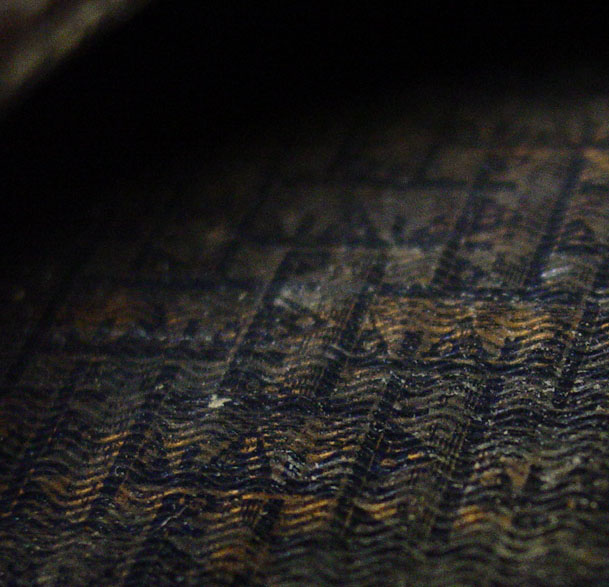 One last little detail...the inside of the back was covered with this decorative paper. It's interesting how it isn't textured at all but looks 3-dimensional (well, the part of it that's in focus, anyway.) All right, it's time for strings.