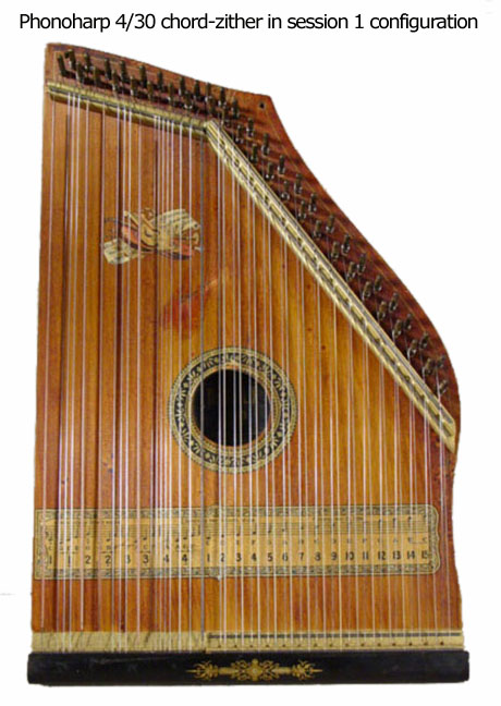 As was first theorized by Gregg Miner, octave-tuned melody pairs turned out to be "the key to the kingdom" of the WP instrument's melody section sound. The melody tuning of the Phono 4/30 and Celestaphone (and virtually any chord-zither), as prescribed by the manufacturers, is two diatonic octaves of C. The WP melody section is tuned in two diatonic octaves of F. We were all stumped for a time not only by the higher pitch of WP's melody range but also by its range, which was nearly three octaves. It was a breakthrough realization that octave-tuned pairs increase the diatonic 15-course melody section's range by a full octave, from its usual two octaves to a full three. notes on my use of tick marks
