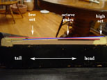 As can somewhat be seen in the images of the instruments, I made special bridges for the melody sections of these instruments. They are described below, and details can be seen in the images. First of all, I do not mean to suggest that I think WP equipped his instrument with special bridges; I don't think he did and the photo, though always open to question, doesn't offer any evidence that he did. The point of my making these bridges was simply to make it easier to approximate certain details of WP's playing, particularly those numbers on which he plays a lot of single-note melody lines rather than octave pairs. However, this can be done pretty easily on a Celestaphone with standard single-level bridges, as not only the pairs but the two strings of each pair are spaced comfortably far apart; both are spaced much wider than the melody section of the 4/30 chord-zither. The idea of these bridges is simply that they are stepped in order to put one string of each pair high (accessible) at one end of the instrument and low (access blocked by the other string of the pair) at the other end of the instrument. I made the 15 high-tuned strings accessible at the head end and the 15 low-tuned ones accessible at the tail end. And of course playing in the middle where they cross offers access to both strings of each octave-tuned pair. This is all made clear by the images, which give close-ups of the head and tail bridges and a side view. The latter didn't come out great, so I "enhanced" it, the red and blue lines representing the high-tuned and low-tuned sets of strings. stringsStrings for all chord-zithers fall into three categories: bass strings: custom-wound gaugesGauge information is given below for all strings used to re-configure a 4/30 fretless zither to approximate the sound of Washington Phillips's instrument, with either session 1 or session 3 accompaniment section configuration. bass string gauges