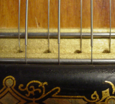 You will notice that this setup required an extra bridge that sits out on the instrument's front. That is because some of the notes in WP's Bb chord are too high for any string stretched the full length of the zither to come anywhere near making it without breaking. (This isn't speculation; this statement is substantiated by experiment. e.g., an .010" string snapped at around F#''', essentially a full octave shy of the mark.) Another comment on the F'''' note in the accompaniment section is that it is audible in some session 1 recordings, though not as prominently as at session 3. I only tried to duplicate it on the session 3 instrument. Incidentally, relative to either of the instruments involved or either of the two sessions in question, there is no significance to my using a Phono 4/30 for the first session setup and a Celestaphone for that of the third. When I began the third session experiment, I had already re-configured a 4/30, and I wanted to compare the physical aspects of the two different instruments in regard to the possibility of their having offered WP motive for creating his double-zither instrument. I refer here to the fact that the melody section of the 4/30 and (especially) the accompaniment section of the Celestaphone are both crowded to the point of making them more difficult to play than the corresponding sections of the other instruments. In my opinion, this comparison added much support to the theory.