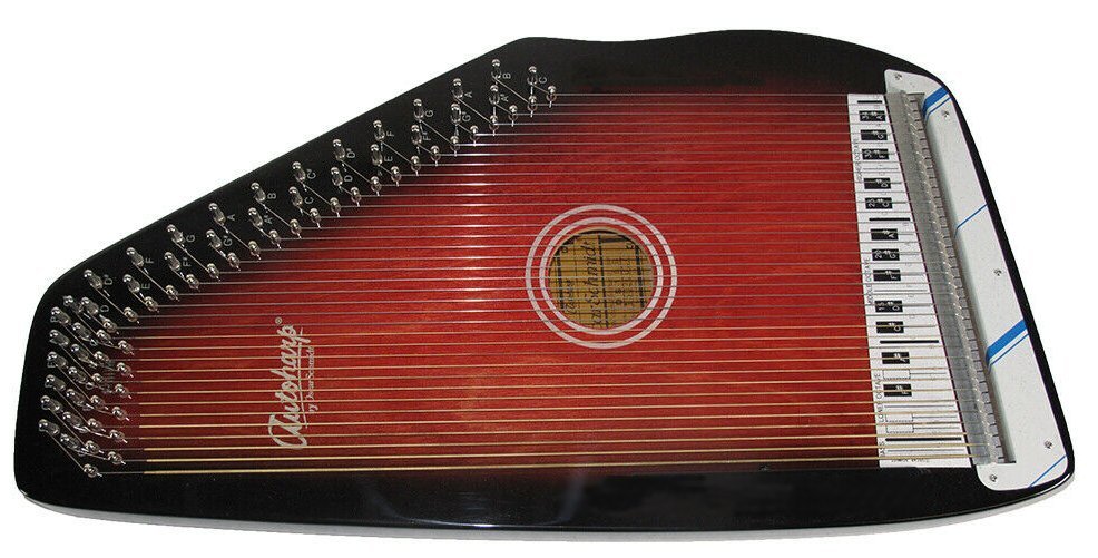 A number of instruments tried to make it simpler to hit the chords you wanted to play. The "Chartola" shown at the right had buttons for playing the chords, but only four chords. According to one expert on the subject, the buttons were in case you needed to bang out a chord in a hurry, but players would still strum the chord strings as well. You'll notice that the melody strings are diatonic only, and that they are doubled. By the way, I once owned an instrument very similar to the Chartola shown in the photo. Instead of buttons, it had a metal plate with staggered slots in it over the chord strings. You'd play the chord you wanted by strumming over the appropriate open slot. The one I owned ($2 at a garage sale) was unplayable and unrestorable and disappeared after being used as a prop in a high school musical. I don't mourn it. Later versions of the Chartola lost the goofy lyre arm shape and baluster-shaped carrying handle. Most of the examples I've seen have a $30 price printed right on the sticker inside the hole - the cost of a new appliance during the era these were being sold.