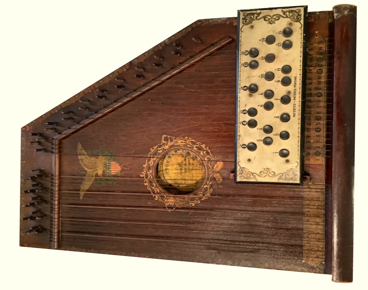 In the late 1800s, one of the most common German zither setups was played on the knees or on a table. It had a fretboard closest to the player for playing chords. The player would fret the fretboard with the left hand. He or she would strum the chords and pick out melodies on the individual strings with the right hand. These instruments have a unique sweet sound (later popularized in the US through the theme of Orson Welles' The Third Man.) However you still had to learn how to form chords with your left hand. German and German-born instrument designers on both sides of the Atlantic took it upon themselves to make the zither easier to play. Forget the Fretboard, We Make the Chords For You